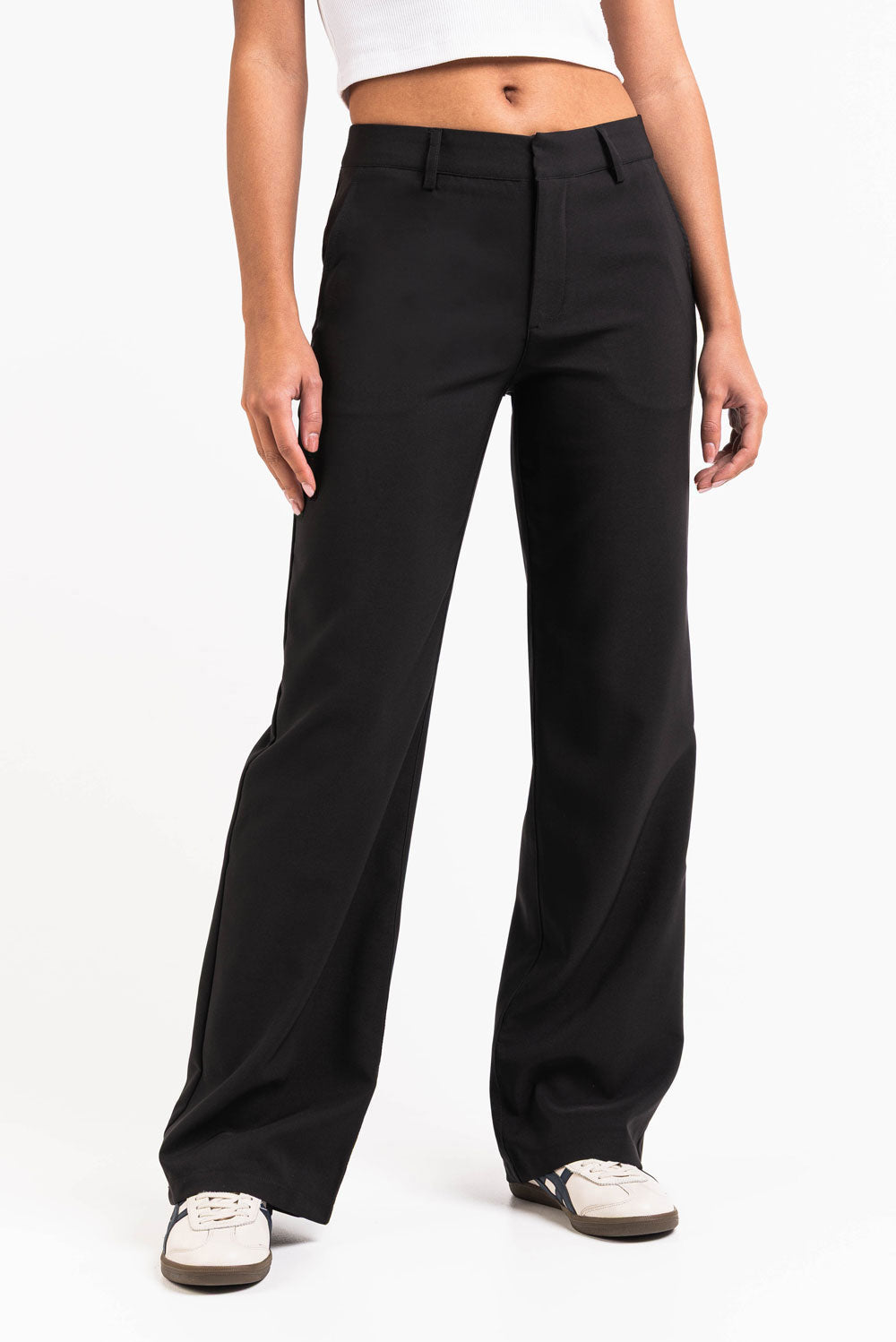 These mid-waist suit pants offer a classic straight-leg fit with functional side pockets. Designed with belt loops and a zip fly, they provide comfort and a polished look for workdays or casual outings.