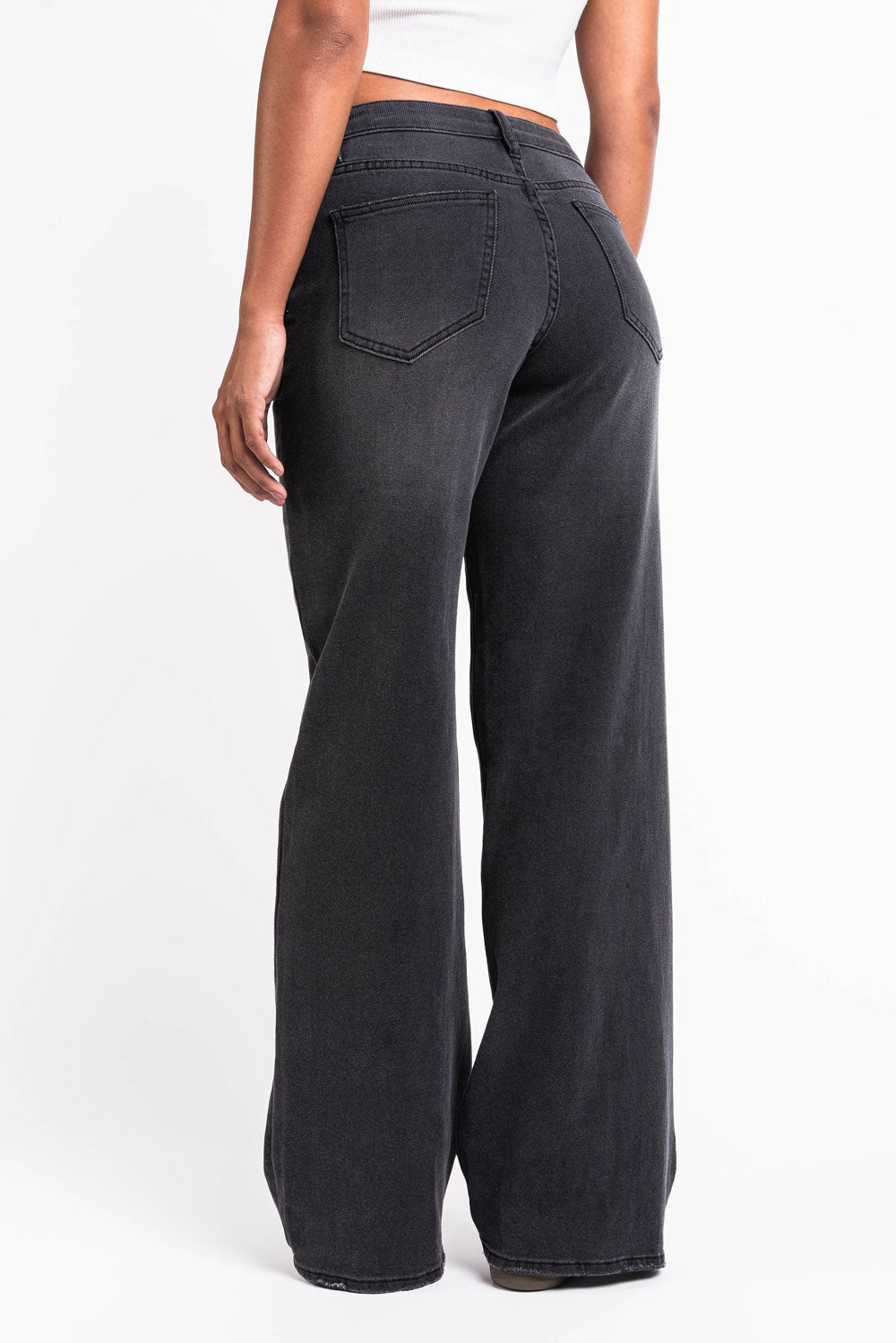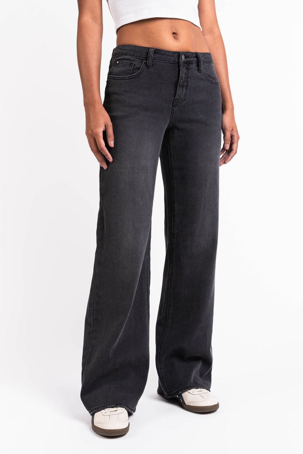 Mid waisted jeans with wide legs and pockets in the front and back. Belt loops that fit both thinner as well as a thicker belt. The pants close with a zipper and button.