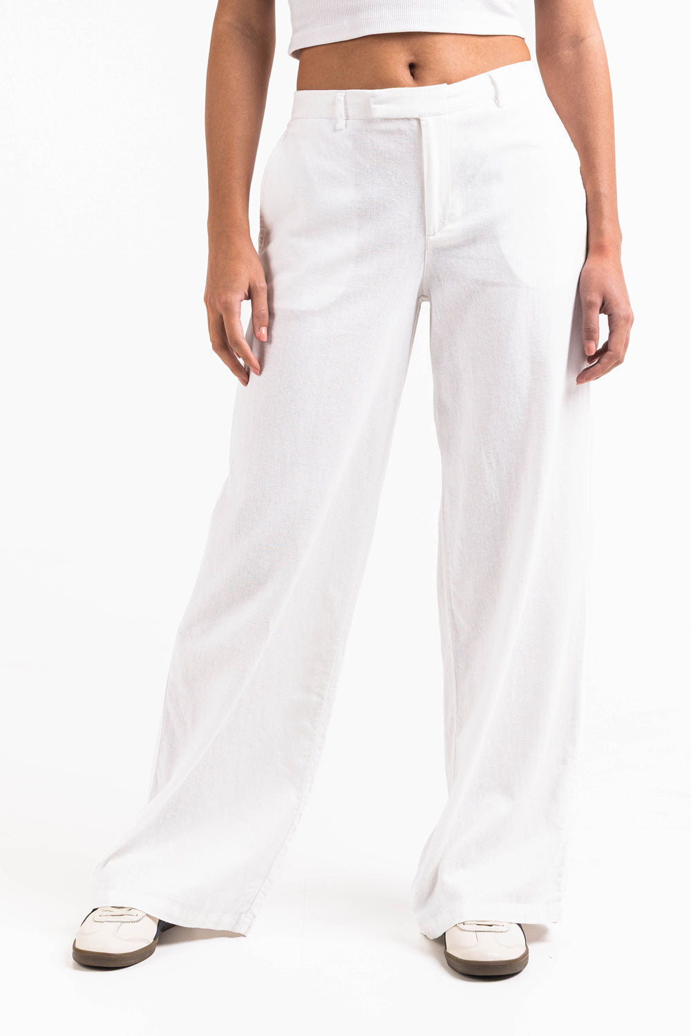 Mid-waist linen pants with wide legs and a relaxed fit. Side pockets, faux back pockets, and belt loops designed to fit both narrower and wider belts. The pants fasten with a zipper, hook, and a hidden button.