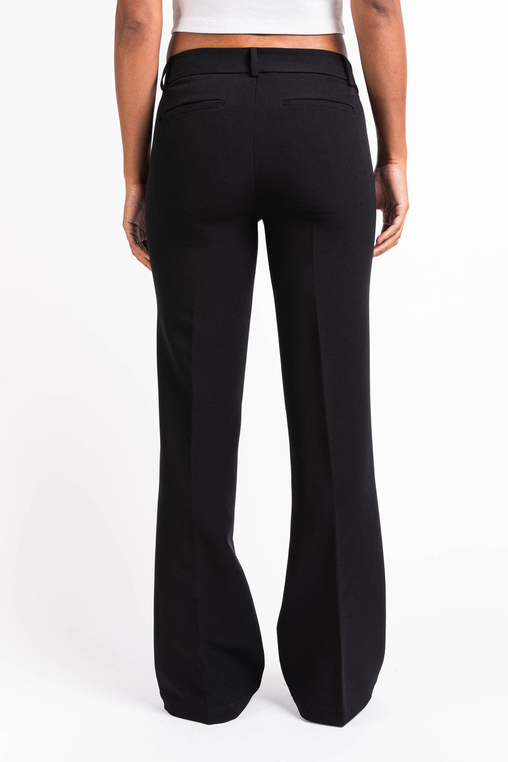 Suit pants with a mid waist and flared legs. Made from a stretch fabric that ensures a comfortable fit all day. Featuring faux back pockets and wide belt loops to hold both narrow and wide belts. The pants close with a zipper, hook, and hidden button.