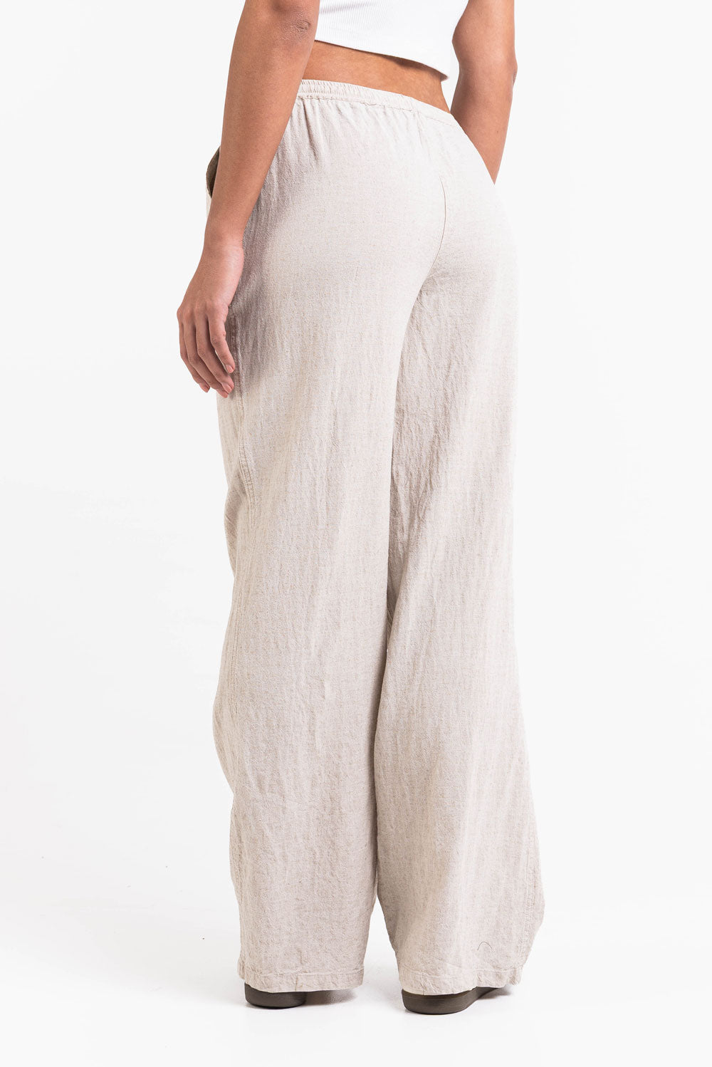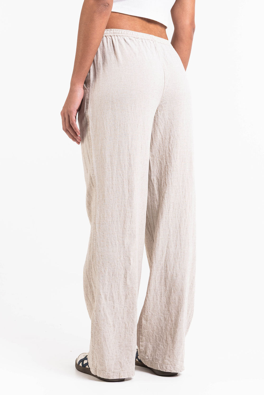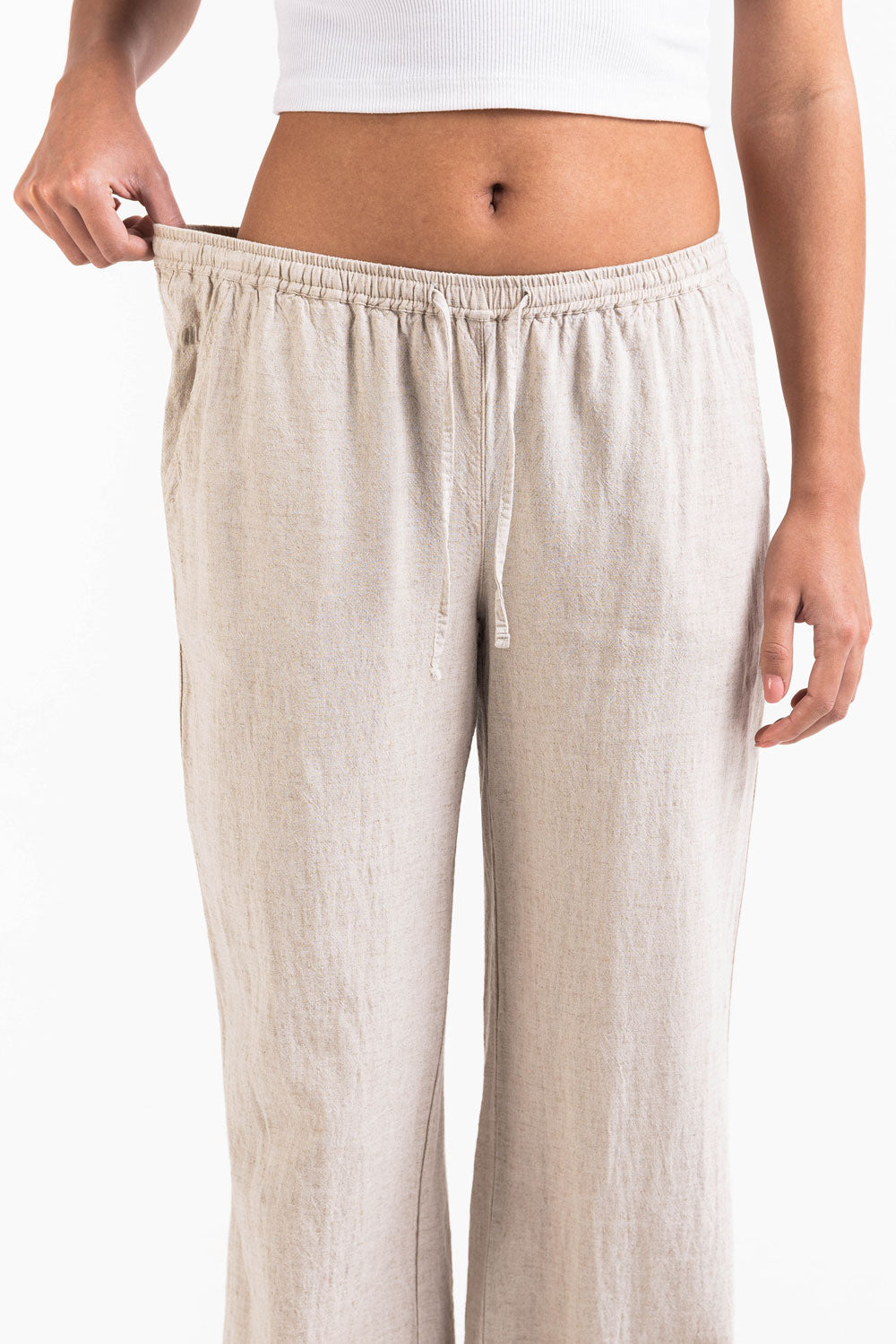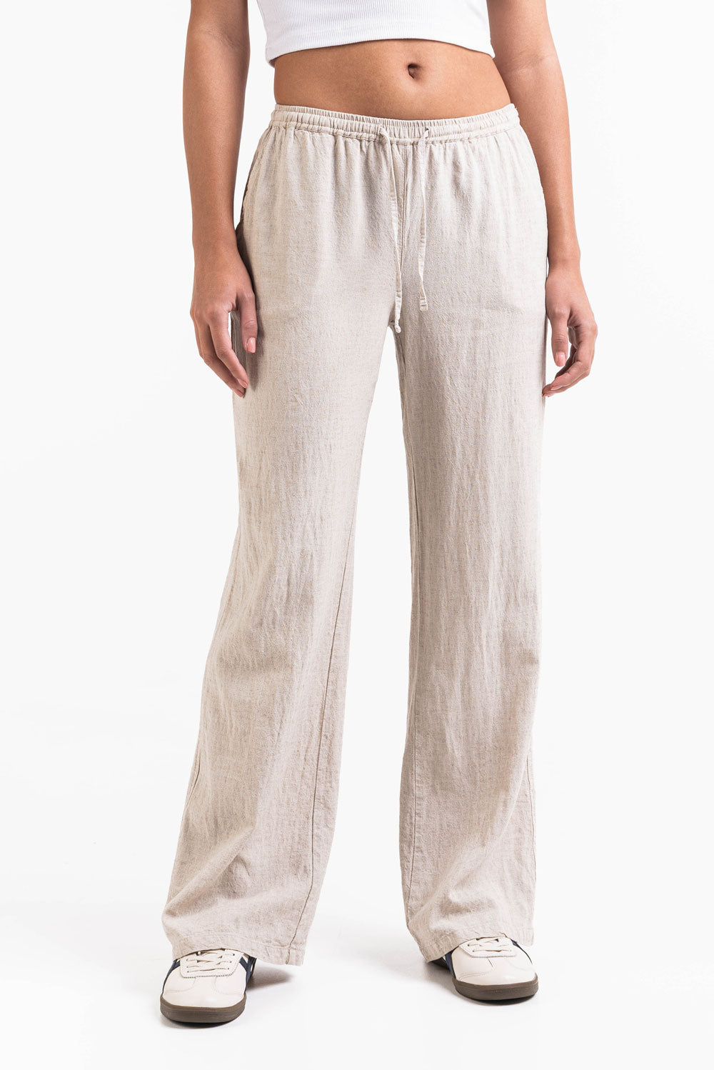 Diese mittel taillierte Leinenhose hat eine entspannte gerade Passform mit praktischen Seitentaschen. Der elastische Bund Kordelzug und das faltbare Design sorgen für eine sichere Passform während sie leicht und atmungsaktiv bleibt.