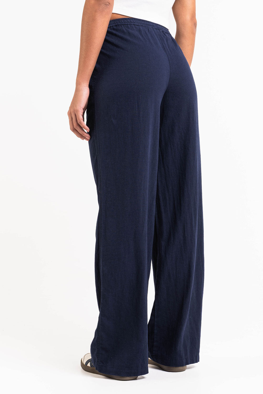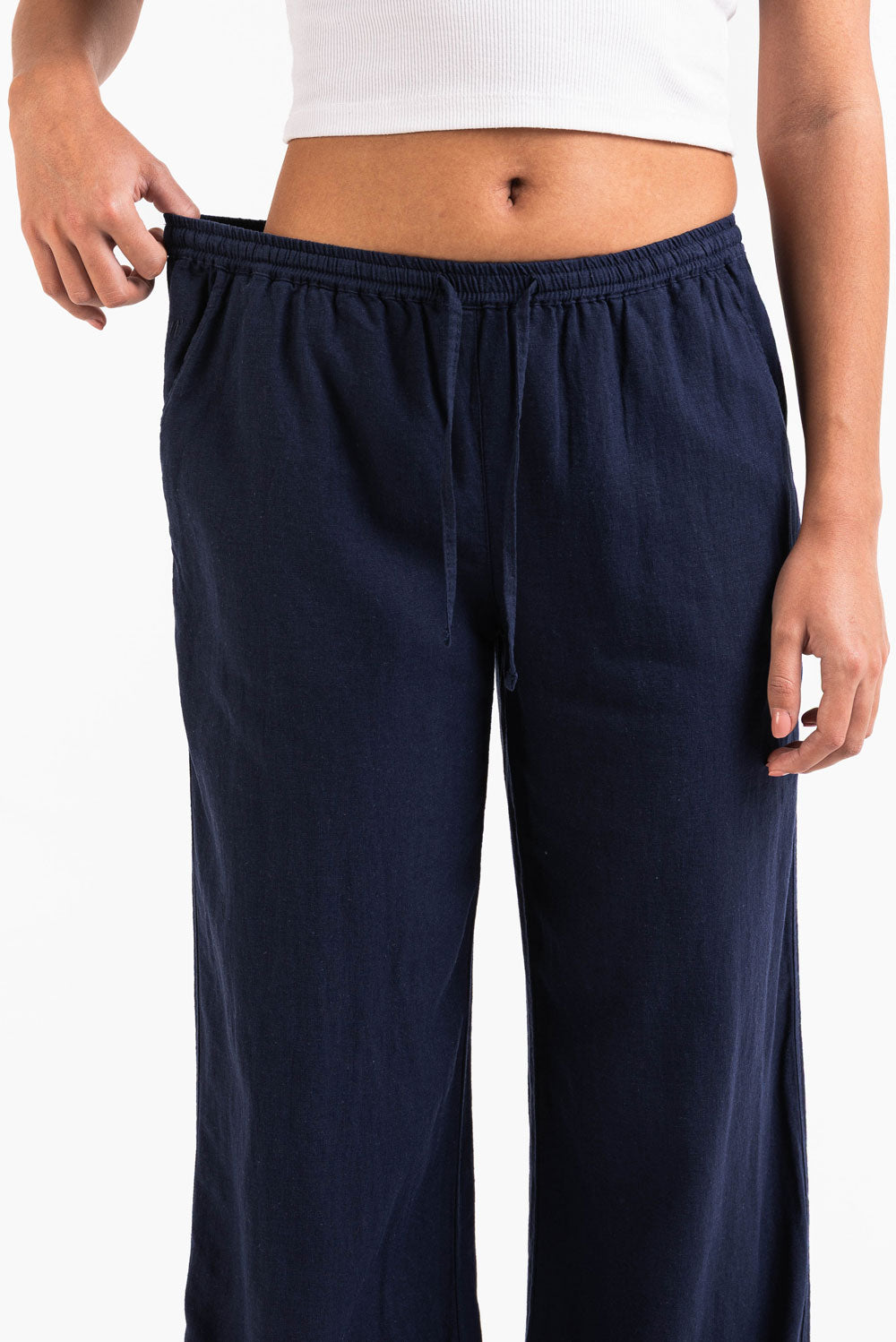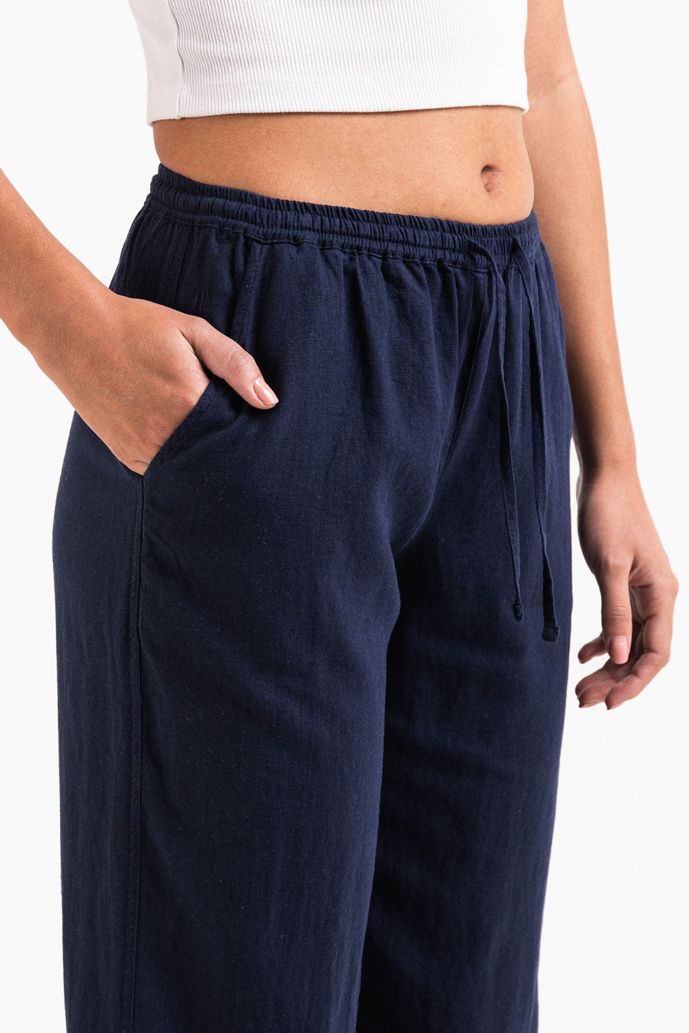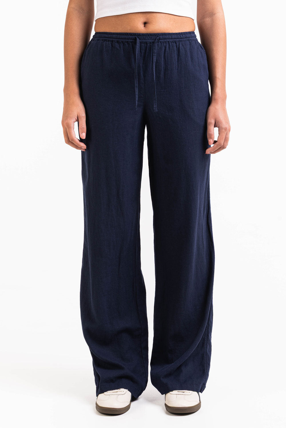 Ce pantalon en lin taille mi-haute présente une coupe droite et décontractée avec des poches latérales pratiques. La ceinture élastique, le cordon de serrage et la coupe repliable assurent un maintien parfait, tout en restant léger et respirant.