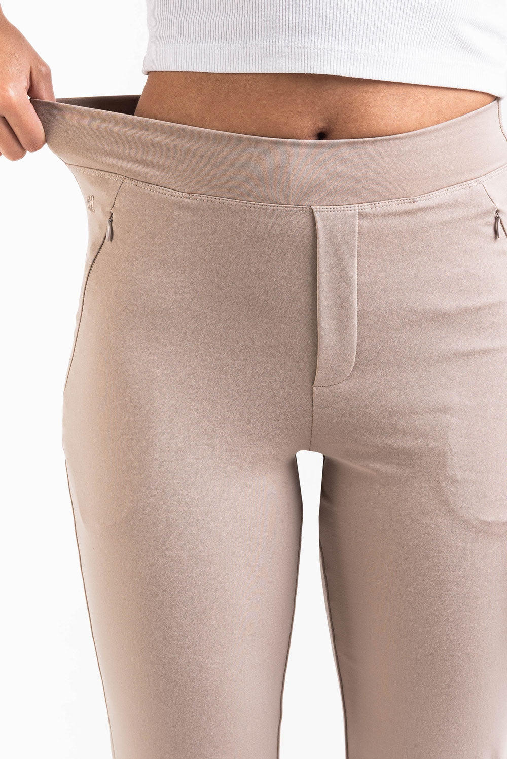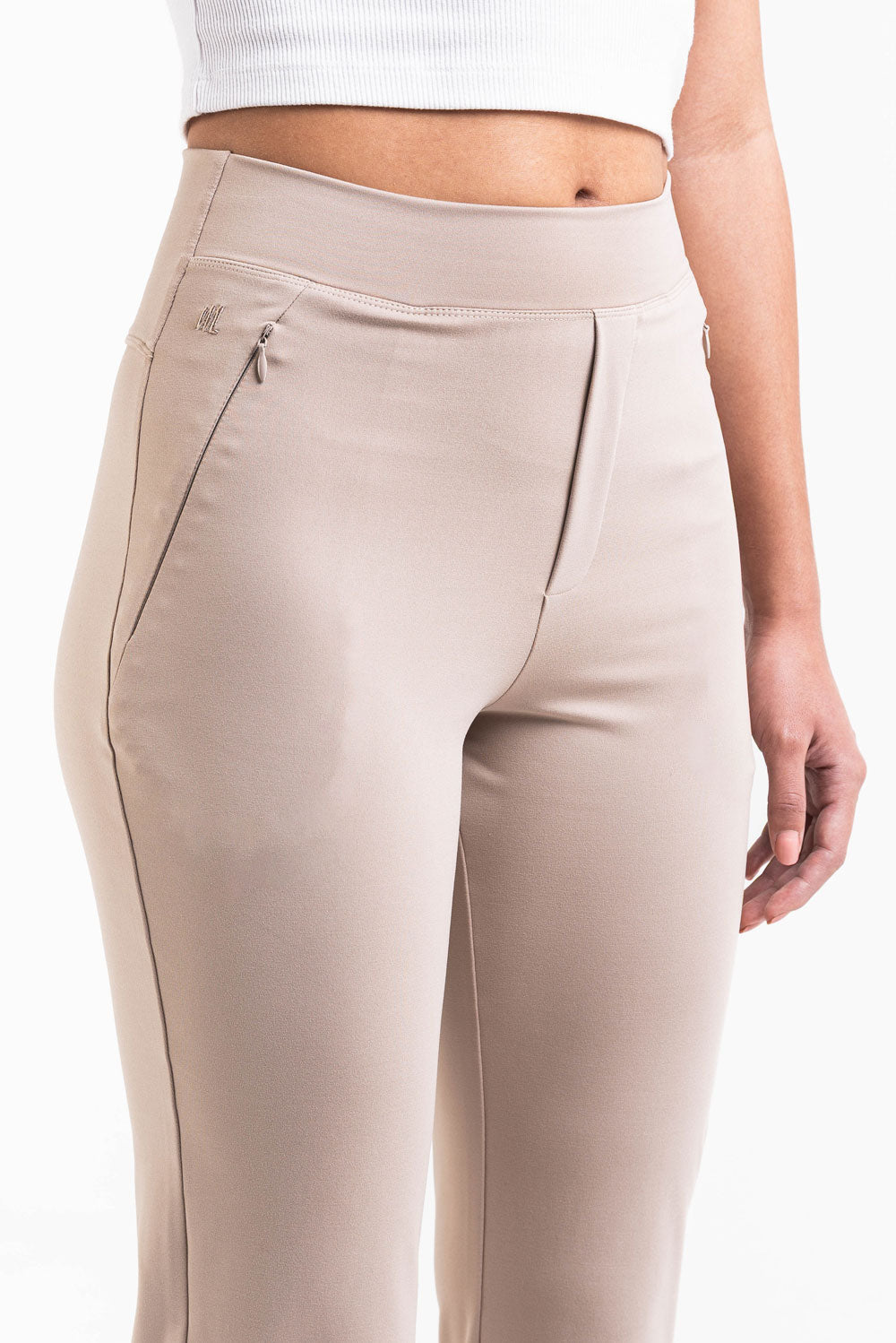 Pantalon hybride alliant le meilleur des deux mondes : un look habillé avec un confort sportif. Deux poches latérales zippées. La ceinture est élastiquée et les jambes sont à coupe bootcut.
