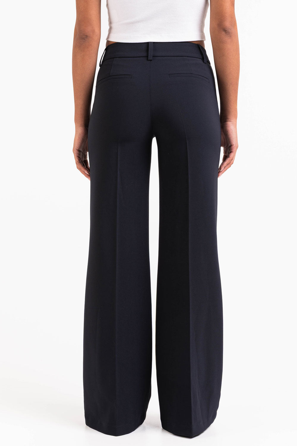 Suit pants with a mid waist and flared legs. Made from a stretch fabric that ensures a comfortable fit all day. Featuring faux back pockets and wide belt loops to hold both narrow and wide belts. The pants close with a zipper, hook, and hidden button.