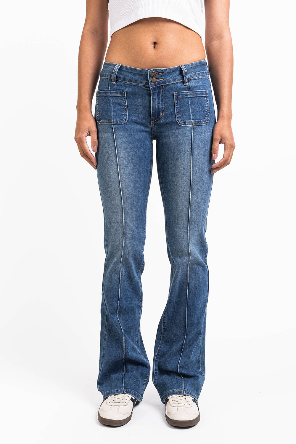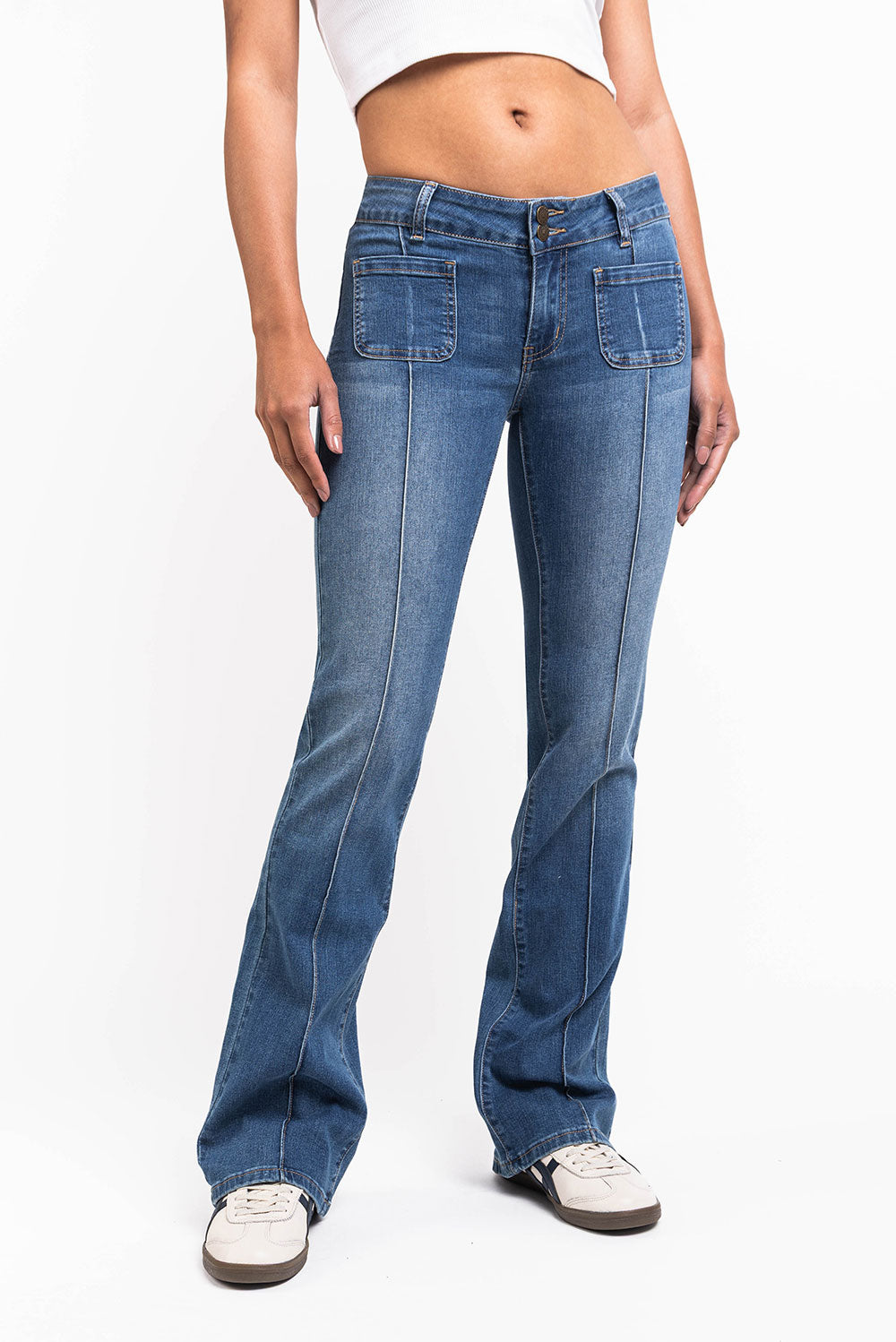 These low-waist jeans feature a timeless bootcut fit with functional back and front pockets. Details like pintucks, belt loops, and a zip fly provide structure, making these jeans a practical choice for everyday outfits.