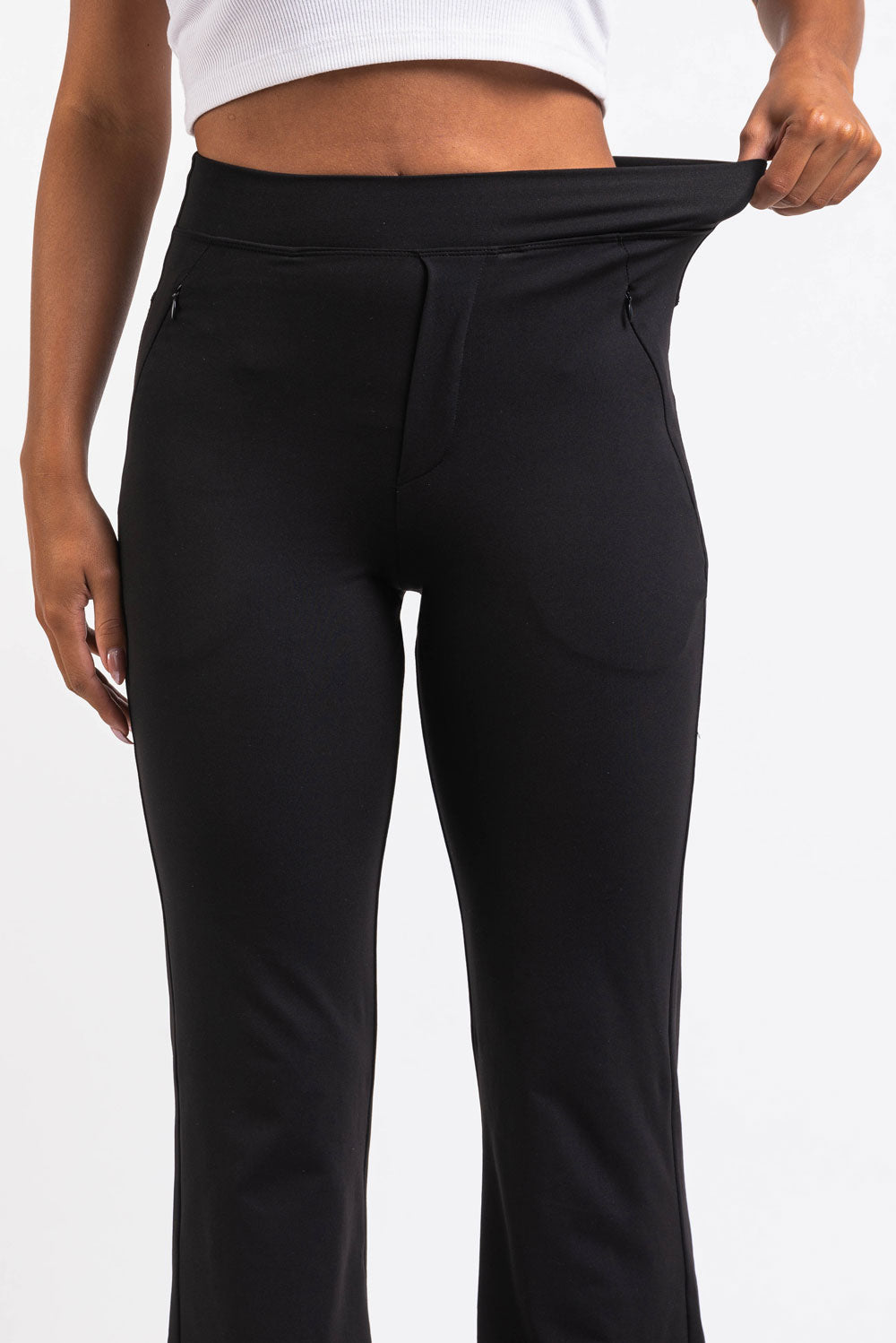 Hybrid pants with the best of two worlds - they're sporty and comfy with a dressy look. The pants have two side pockets with zippers. The waist is stretchy, and the legs are flared.