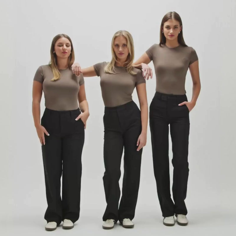 Mid waist suit pants with straight legs and a wide waistband. Side pockets and fake back pockets. The pants close with a zipper, hook, and hidden button.